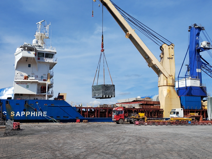 近日,外貿(mào)船舶“藍(lán)寶石”輪順利靠泊港口經(jīng)營公司碼頭裝運大型外貿(mào)設(shè)備,這是港口經(jīng)營公司今年以來首次靠泊的萬噸級外貿(mào)船舶。