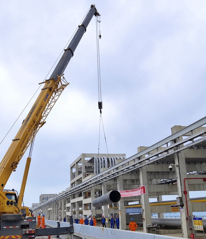 據(jù)悉,30萬噸級原油碼頭工程設(shè)置2根DN900的原油運(yùn)輸主管,起點(diǎn)為30萬噸級原油碼頭E1泊位,終點(diǎn)為東防波堤堤根的公用管廊終點(diǎn),原油管線總長度約為6km,此次施工吊裝的首根原油管道長約12.29米,重約3.46噸。公共管廊處管線多,作業(yè)空間狹隘,需要在保護(hù)已有管線設(shè)備的前提下進(jìn)行安全精準(zhǔn)化吊裝作業(yè),對此,臨時黨支部多次協(xié)調(diào)組織監(jiān)理單位、施工單位和運(yùn)營單位的專業(yè)人員提前規(guī)劃管道吊裝方案,協(xié)調(diào)組織各方專業(yè)人員現(xiàn)場值守,從而保障管道吊裝作業(yè)安全可控地順利開展。