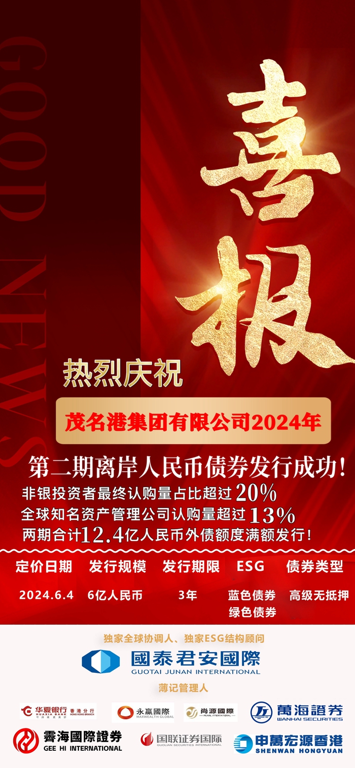 6月4日,茂名港集團(tuán)有限公司成功定價(jià)2024年第二期境外人民幣債券,在港交所、澳交所掛牌,發(fā)行規(guī)模6億人民幣,茂名港集團(tuán)兩期共12.4億人民幣境外債額度圓滿發(fā)行成功。兩期債券獲得綠色債券和藍(lán)色債券雙重認(rèn)證,作為全國(guó)首筆“藍(lán)標(biāo)+綠標(biāo)”境外債券,為茂名市清潔能源、綠色交通、可持續(xù)發(fā)展的新質(zhì)生產(chǎn)力等重要領(lǐng)域提供了資金支持。